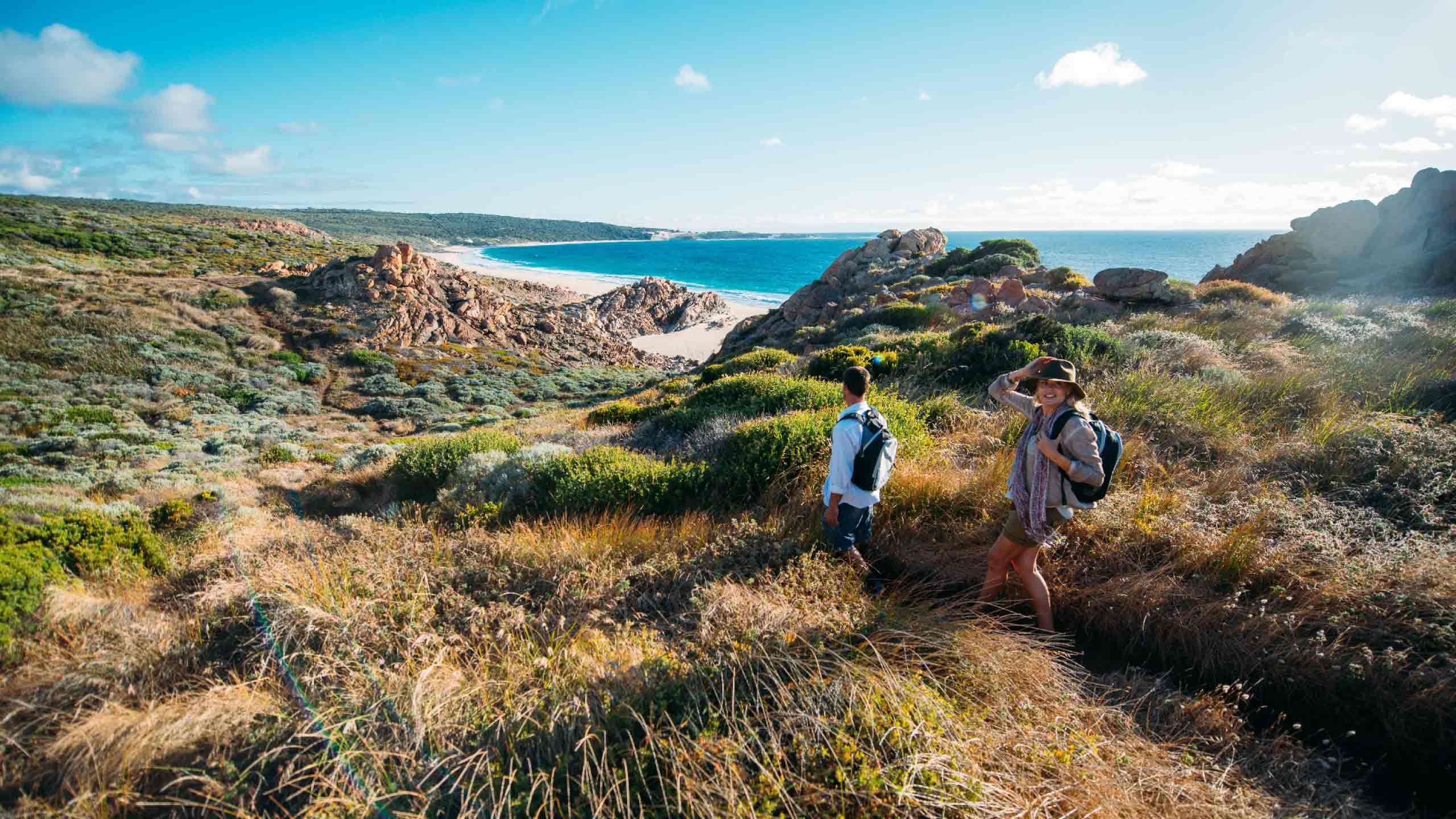 The terrain is a combination of white sand, limestone cliffs, granite rock, old 4WD tracks, sealed paths and bushy track. The sections of the Cape to Cape track used for the tour are rated as moderate, with a couple of easier sections around Sugarloaf Rock and Boranup forest providing a breather.