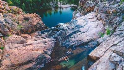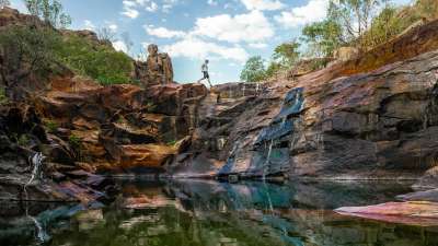 Afterwards, visit Gunlom Falls, made famous by the movie Crocodile Dundee. With its cascading waters, pristine plunge pools and a natural infinity pool, Gunlom offers a short, steep walk to the top of the falls where you will be rewarded with incredible sweeping views of the southern hills and ridges of Kakadu and the Arnhem Land Escarpment. For those wanting a less strenuous walk, enjoy the main pool at the base of the falls before enjoying a BBQ lunch prepared by your guide.