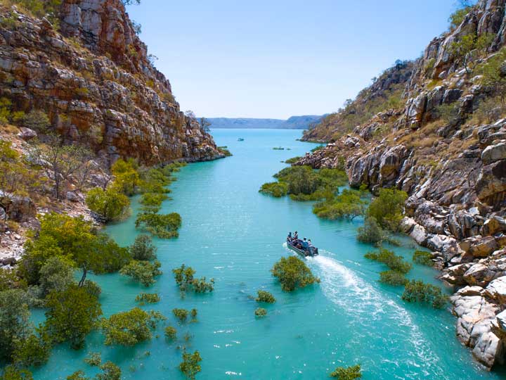 There is nothing quite as immersive, invigorating, profound and peaceful as a Kimberley Coast cruise. Here, in one of the oldest and largest landscapes on Earth, is a largely untouched wilderness of striking contrasts, with 1,200-kilometres (746mi) of sheer cliffs, pristine white sands and clear turquoise waters teeming with marine life. The Southern Coast will wow with prolific islands, inlets and pockets of rainforest home to many species of birds and other wildlife, while the Northern Coast is sure to impress with broad rivers, extensive waterfalls, incredible Aboriginal rock art and fascinating World War II history.