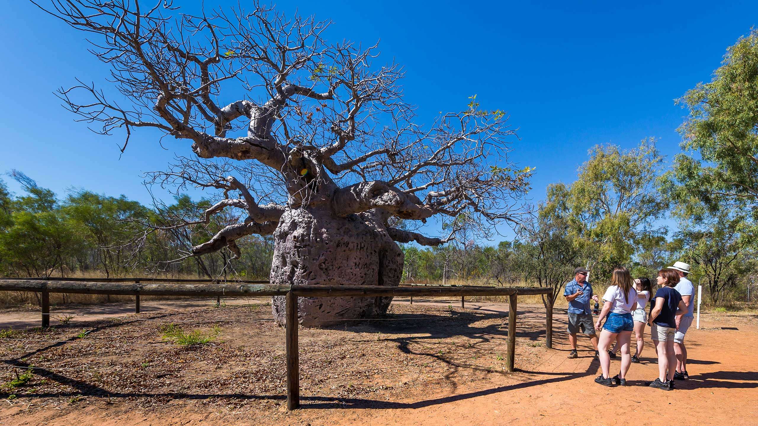 Departing Broome, your family safari starts with a visit to the infamous Derby ‘Boab Prison Tree’. Known as Kunumudj, this remarkable tree has a circumference of over 14-metres (46ft) and is believed to be 1,500 years old. The tree is said to have been used as a prison, or as a holding area for Aboriginal prisoners being transported long distances to the goal at Derby.